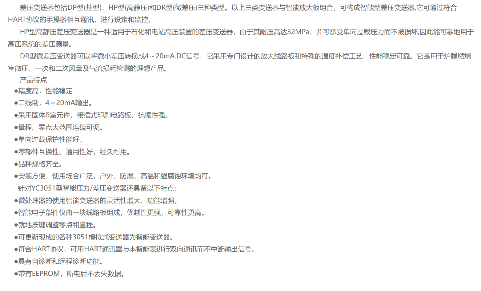 HP-3351电容式差压变送器可应用于石化、冶金、电力、食品、医药、造纸和纺织等工业部门,差压变送器主要用于测量液体、气体或蒸汽的差压、压力、液位和密度;与节流孔板配用,还可用于测量流量,将其转换成4~20mA.DC信号输出,传送给显示、计算、调节或控制等仪表,可组成各种自控系统。